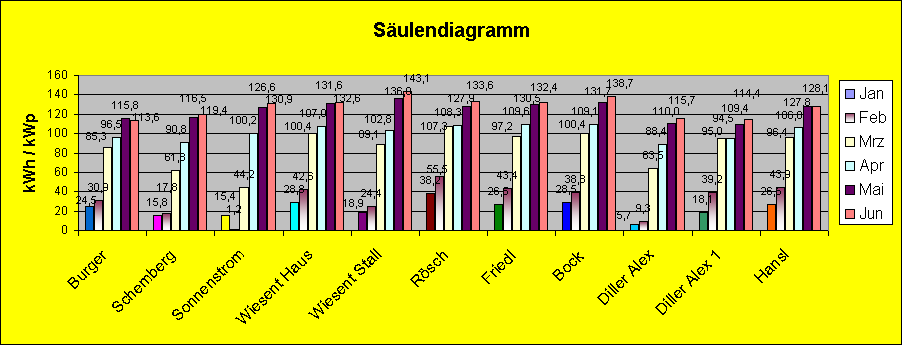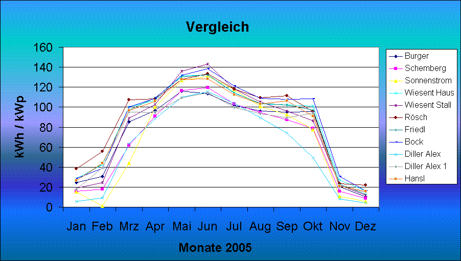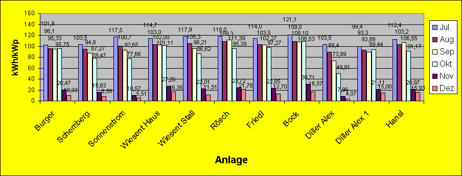 Dies soll nur ein grober Vergleich sein, um zu zeigen, wie sich Anlagen unterschiedlicher Ausrichtung und Dachneigung verhalten (Techn. Daten entnehmen sie bitte den jeweiligen Anlagendaten).Er sagt nichts über die Leistungsfähigkeit einzelner Anlagen bzw. Anlagenteile wie z.B. PV-Module oder Wechselrichter aus. Hier spielen noch viele andere Faktoren - Modulausrichtung, Dimensionierung der Anlagenteile, Schatten, Kühlung der Module, Aufstellort Wechselrichter, Leitungslänge usw. - eine Rolle.