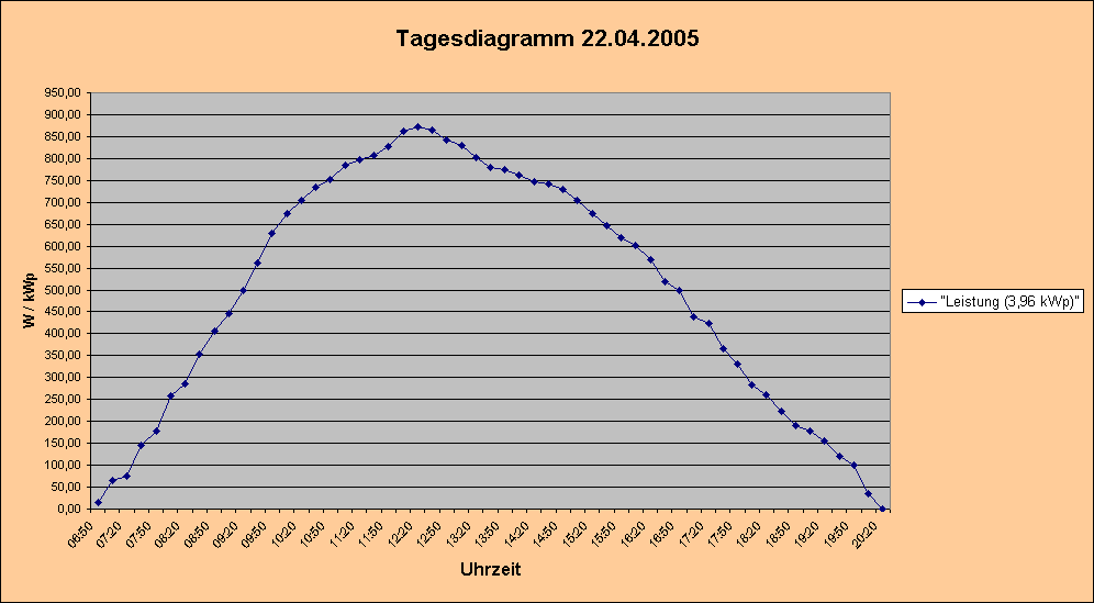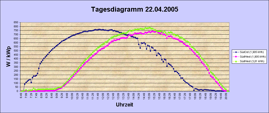 Tagesdiagramm vom 22.04.2005Wetter: Sonnig vom Sonnenaufgang bis zum SonnenuntergangTemperatur: Sonnenaufgang 0°C Mittag 12°C Abends 8°C