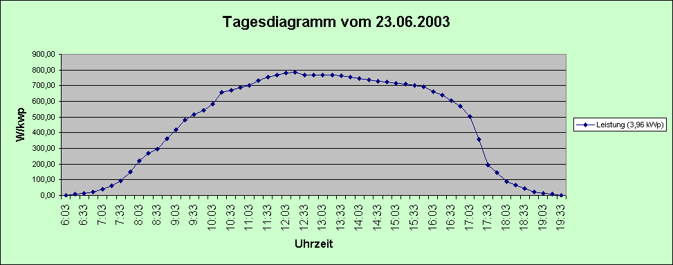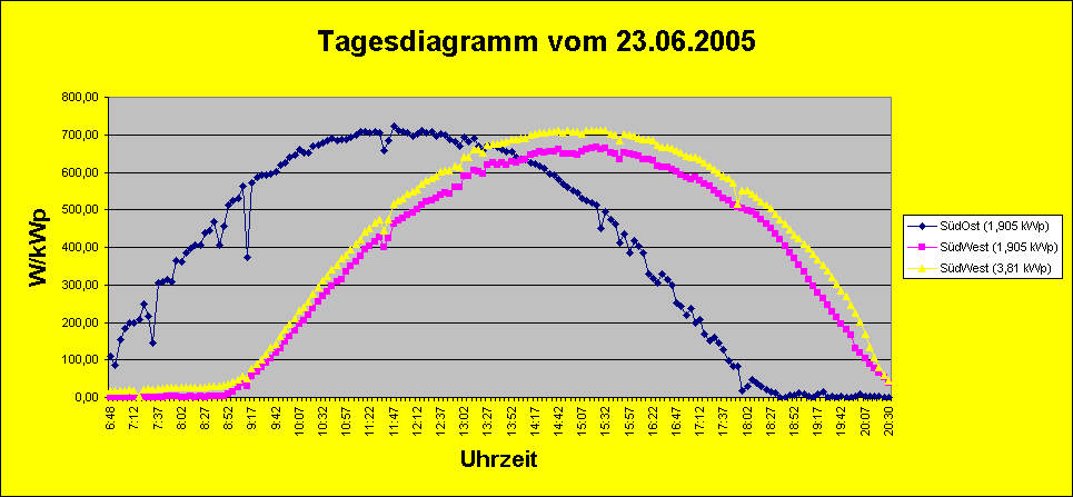 Tagesdiagramm vom 23.06.2005Wetter: Sonnig vom Sonnenaufgang bis zum SonnenuntergangTemperatur: Sonnenaufgang 14°C Mittag 30°C Abends 18°C